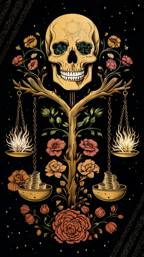 Welcome to the newest chapter of Ancient Oasis, “Skull & Blooms.” We’re excited to unveil our first drop of the season: “Harmony of Growth.” This compelling digital art piece encapsulates life’s inherent contrasts—a skull cradled by nature’s bloom, and ephemeral flames balanced against enduring coins. Reserved exclusively for our ‘Infinite Lives’ members, this limited edition beckons you deeper into a world where light and shadow dance in eternal interplay.